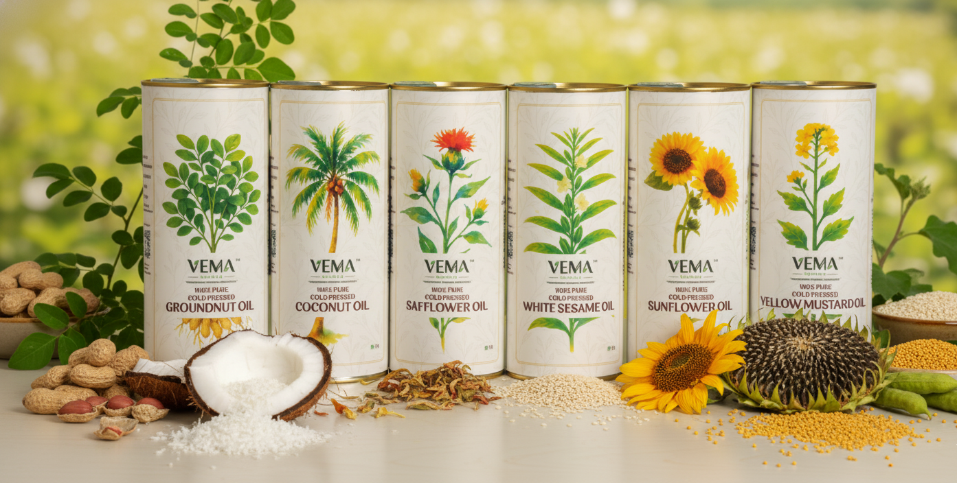 Before Vema Naturals became a brand, we did something brands rarely do — we went back to the beginning. To the soil. To the farms. To the hands that know more about seeds than any laboratory ever will. We travelled across growing belts, not to find suppliers…but to find truth. We sat with farmers who’ve spent lifetimes reading the land the way others read books. They told us which soil breathes best for mustard, which region grows sesame with natural sweetness,which groundnut carries more aroma because the earth it grows in is richer, older, calmer. We walked through fields,touched the soil,smelled fresh harvest,watched seeds being cleaned by hand,and understood something simple yet profound: If the seed isn’t pure,no process — not even the best — can create a truly pure oil. So we didn’t start our journey in a factory.We started it in villages, with farmers whose knowledge is older than textbooks and more accurate than trends. We evaluated crops the way nature intended: by season, by soil, by sunlight, by region, by the quiet wisdom of people who know when the earth is ready to give its best. We rejected more seeds than we accepted. We questioned more methods than we adopted.We chose our crops based on purity, nutrient density, and natural energy,